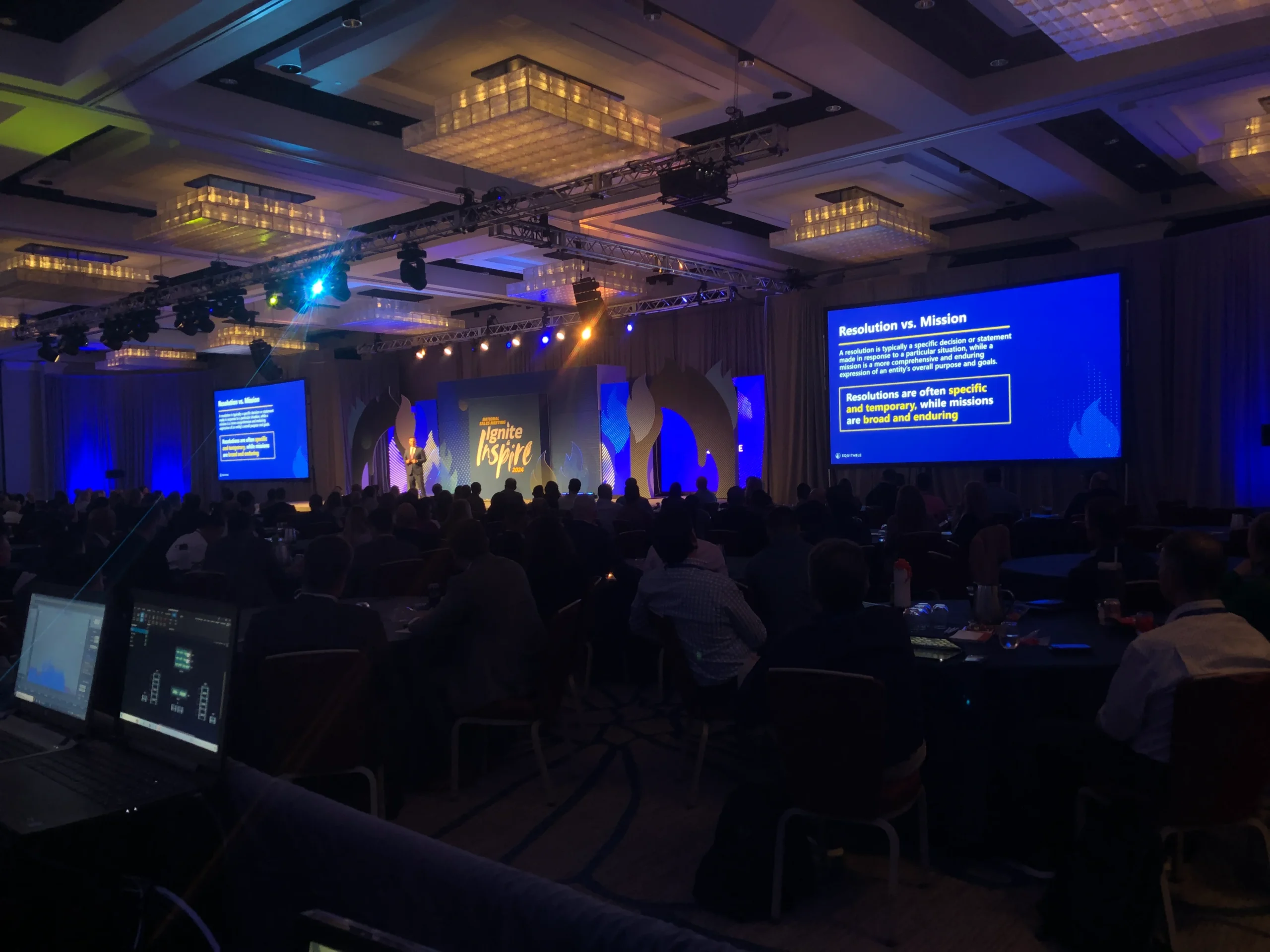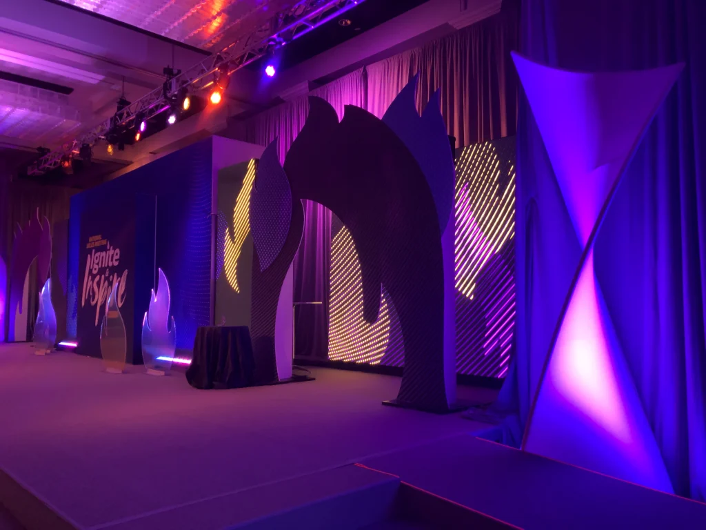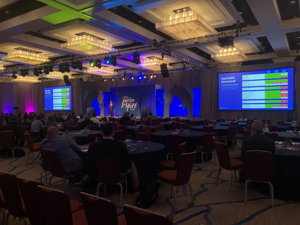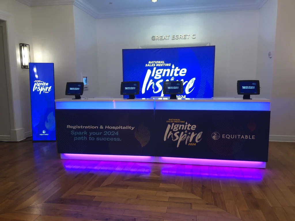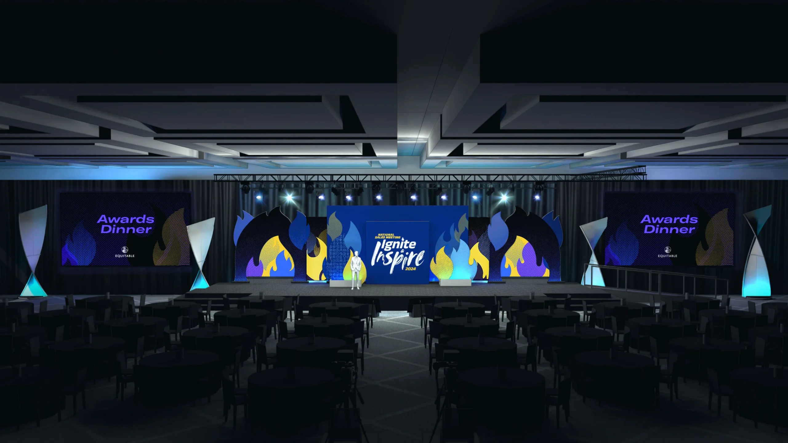 Equitable’s 2024 National Sales Meeting brought advisors together to recognize achievement, align on future opportunity, and reinforce partnership across the organization. Designed around the theme Ignite & Inspire, the environment was customized to celebrate advisor success while setting a forward-looking tone. Immersive branding treatments and a cutting-edge set design carried the theme throughout the venue, transforming the space into a cohesive experience that balanced recognition, motivation, and strategic focus.