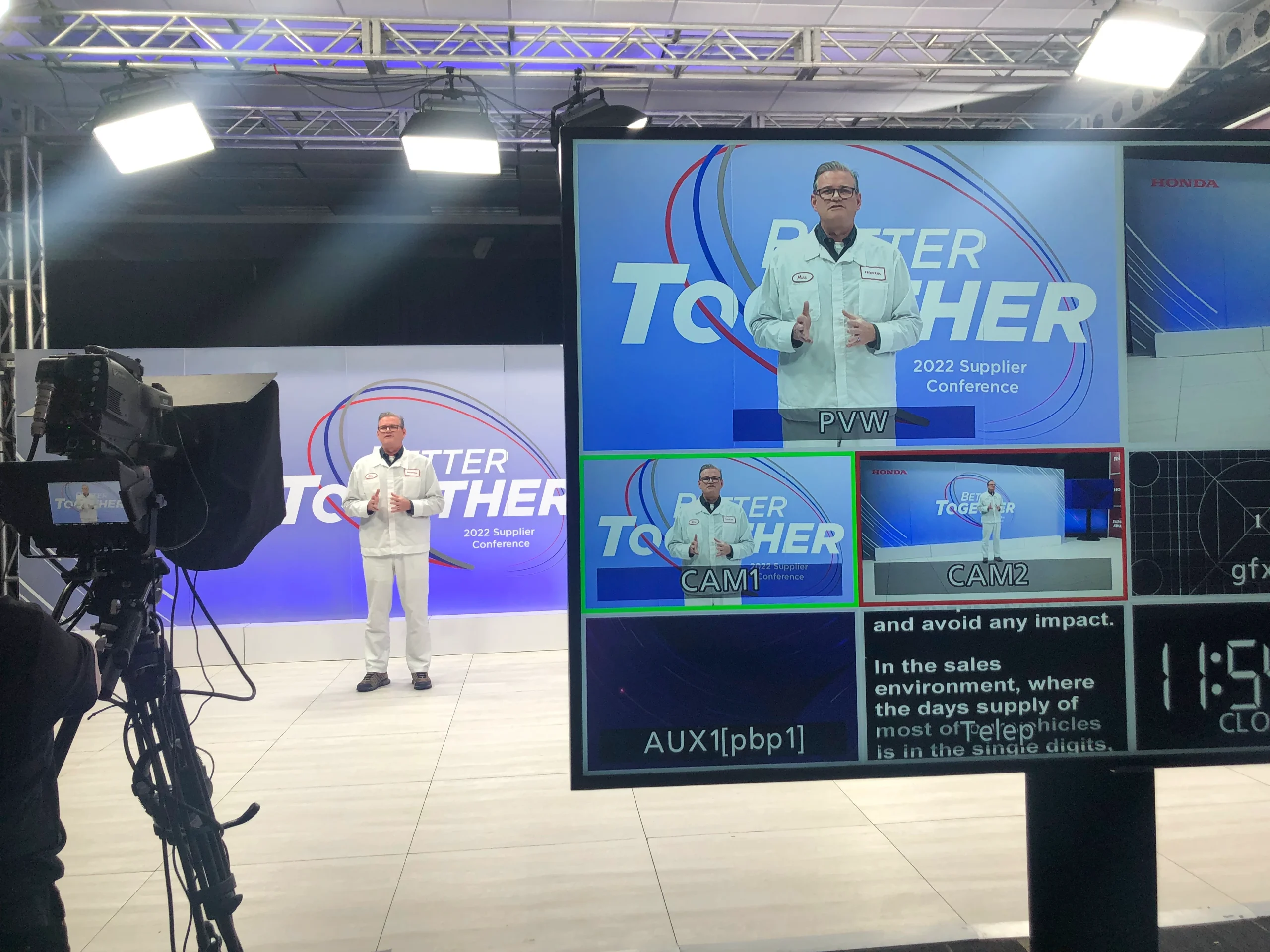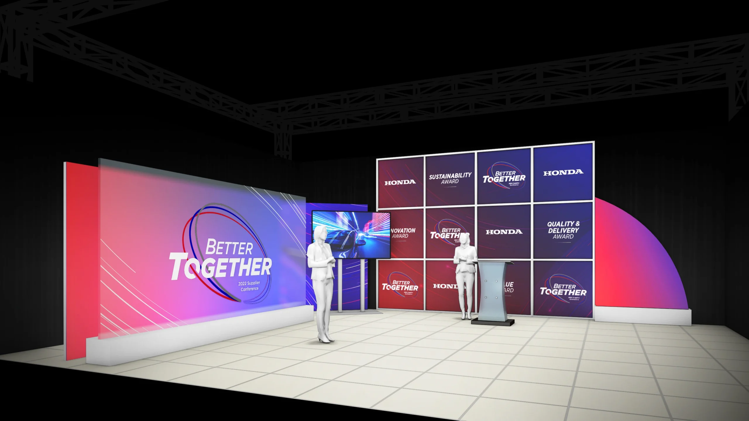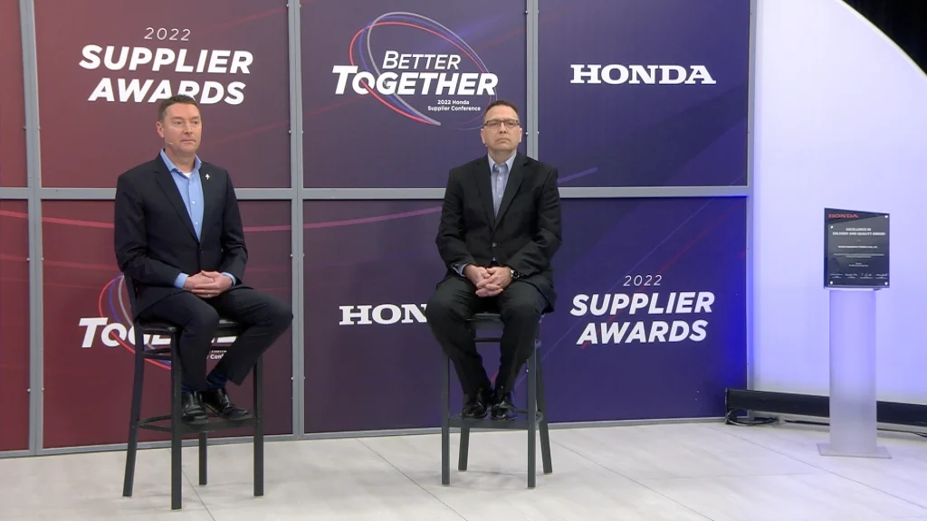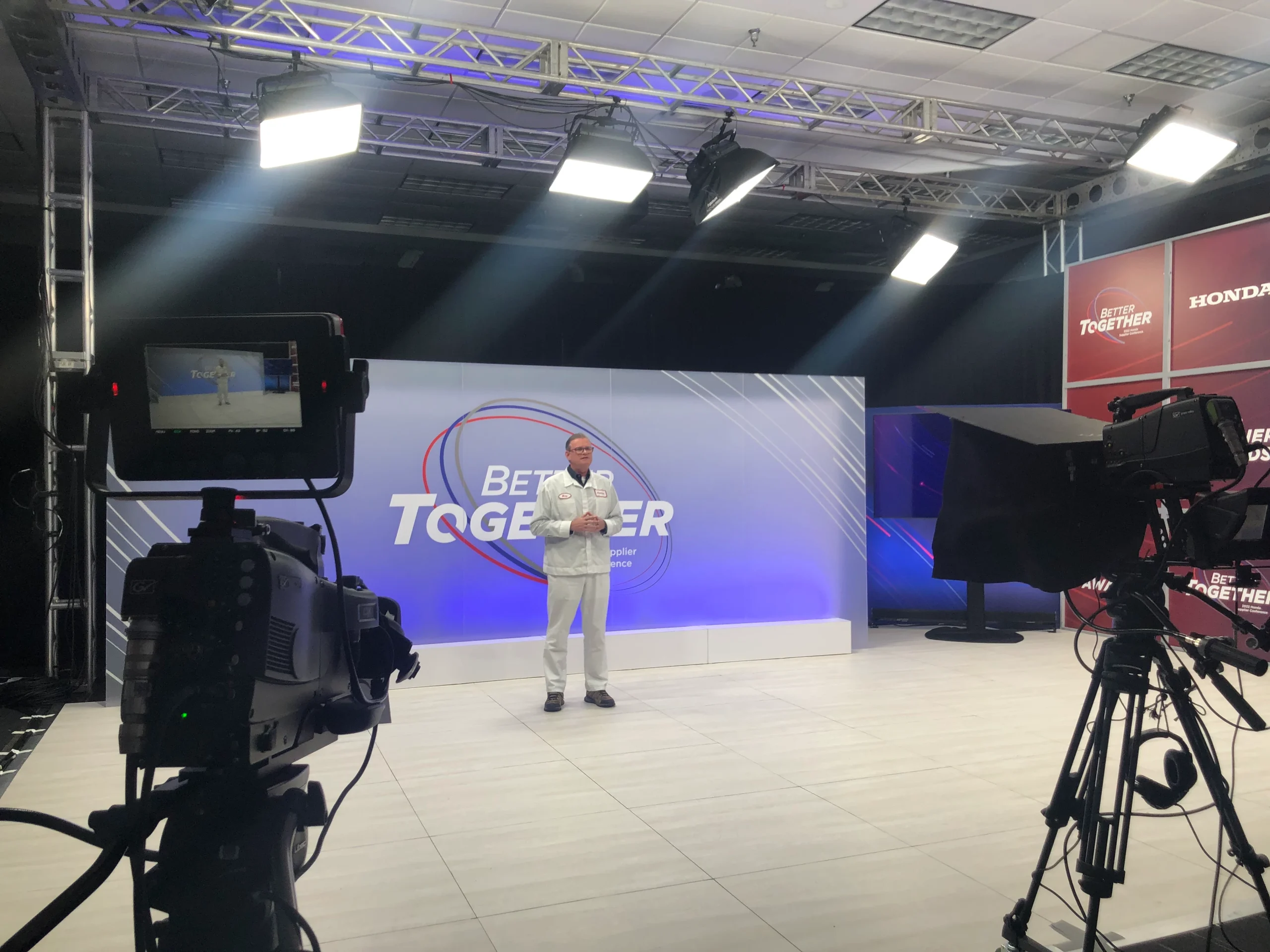 In addition to building a web-based platform to host Honda’s annual Supplier Conference, our team designed and built a custom studio that reflected the event theme while staying true to the Honda brand. Using a combination of fabricated and printed elements, we created two unique vignettes, which were utilized to establish change and rhythm throughout the broadcast. A monitor was incorporated into the set as well for presentation hand offs from the speakers in studio, to virtual speakers in California.