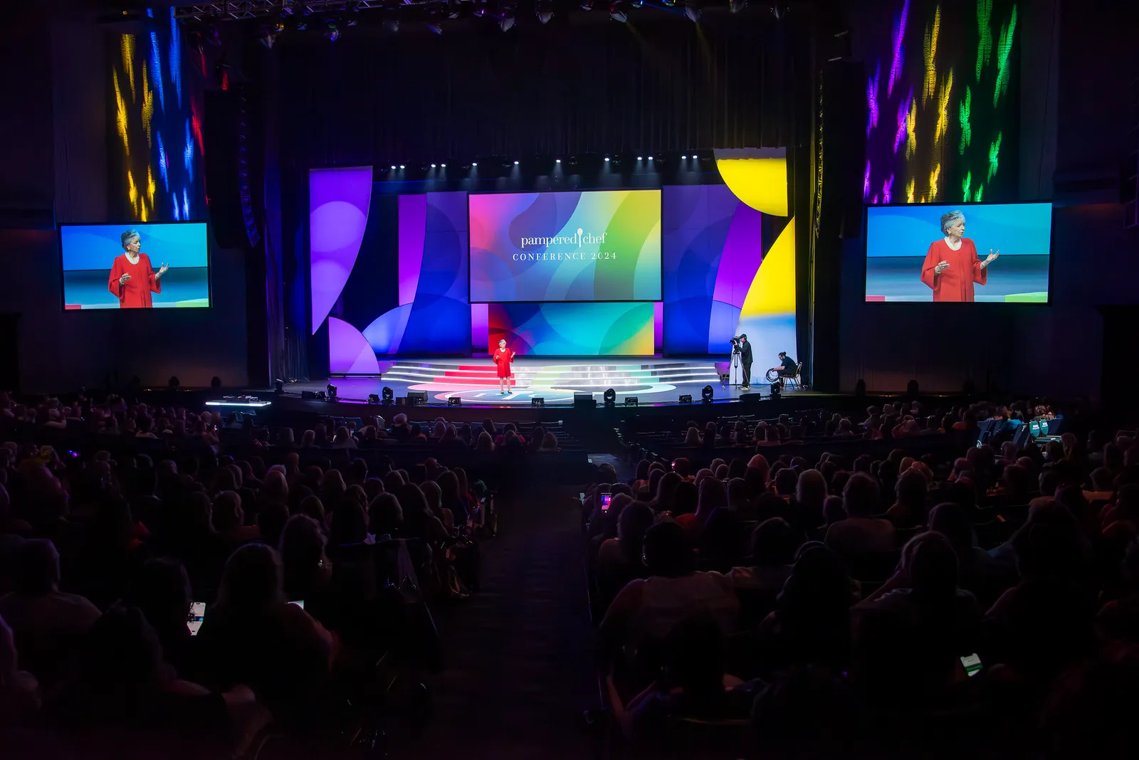 Pampered Chef brought consultants from across the country to Chicago’s Rosemont Theatre for a national conference focused on announcements, training, and recognition. To support the event’s theme, we designed a dynamic stage environment using layered screens, scenic elements, and vivid gradients that allowed for multiple entrances and immersive product storytelling. Audience engagement stayed high as presenters moved through the crowd for live interaction and giveaways, while an onstage DJ and flexible LED environments enabled seamless transitions and in-the-moment adaptability throughout the program.
